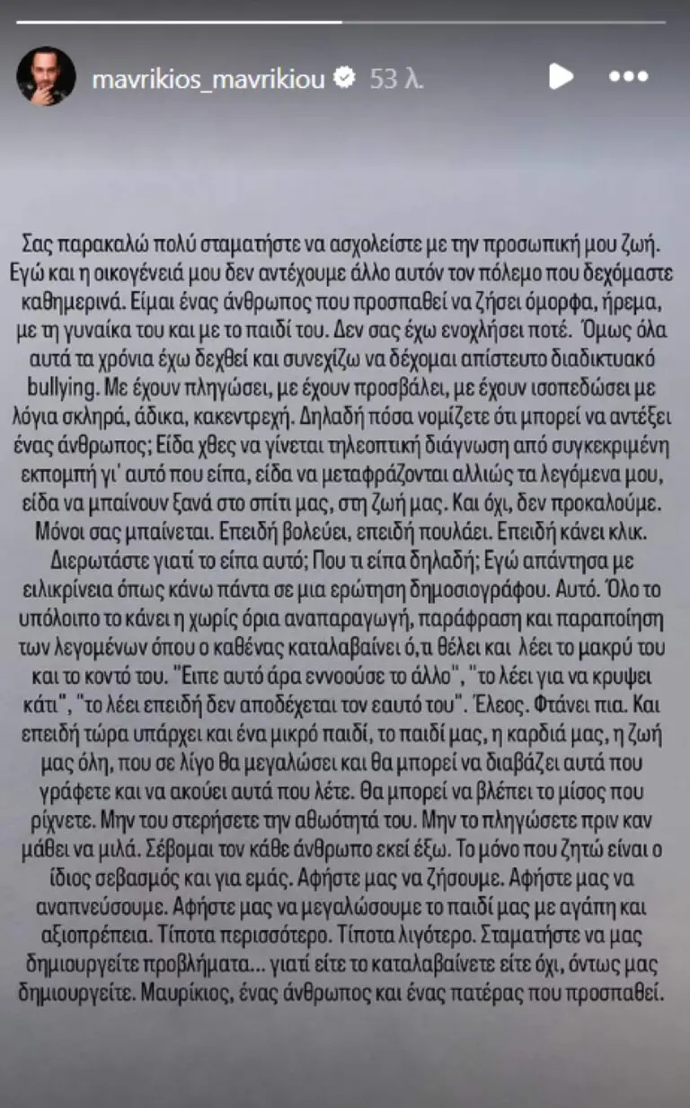 Εγώ και η οικογένειά μου δεν αντέχουμε άλλο αυτόν τον πόλεμο που δεχόμαστε καθημερινά. Είμαι ένας άνθρωπος που προσπαθεί να ζήσει όμορφα, ήρεμα, με τη γυναίκα του και με το παιδί του. Δεν σας έχω ενοχλήσει ποτέ. Όμως όλα αυτά τα χρόνια έχω δεχθεί και συνεχίζω να δέχομαι απίστευτο διαδικτυακό bullying. Με έχουν πληγώσει, με έχουν προσβάλει, με έχουν ισοπεδώσει με λόγια σκληρά, άδικα, κακεντρεχή. Δηλαδή πόσα ψυχολογικά χτυπήματα μπορεί να αντέξει ένας άνθρωπος; Είδα χθες να γίνεται τηλεοπτική διάγνωση από συγκεκριμένη εκπομπή γι’ αυτό που είπα, είδα να μεταφράζονται αλλιώς τα λεγόμενά μου, είδα να μπαίνουν άτομα στο σπίτι μας, στη ζωή μας. Και όχι, δεν προκαλώ.
