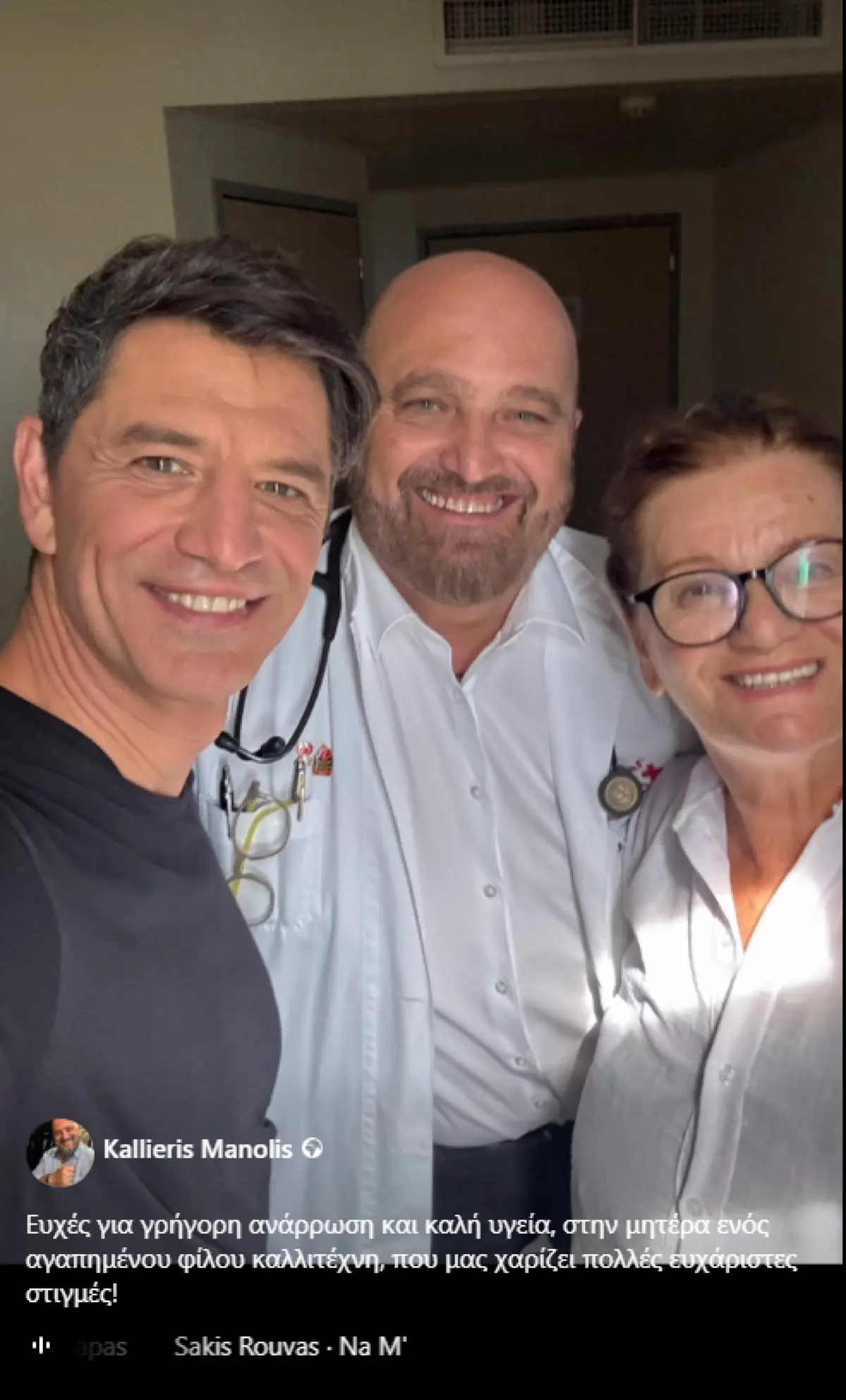 “Ευχές για γρήγορη ανάρρωση και καλή υγεία, στη μητέρα ενός καλλιτέχνη που μας χαρίζει πολλές ευχάριστες στιγμές” έγραφε κάτω από την ανάρτησή του ο Καθηγητής Καρδιολογίας με τον Σάκη – με τον οποίο συνδέεται με χρόνια φιλία – και με την μητέρα του.