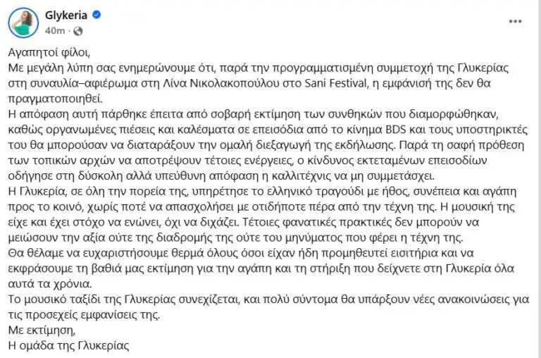 Με μεγάλη λύπη σας ενημερώνουμε ότι, παρά την προγραμματισμένη συμμετοχή της Γλυκερίας στη συναυλία–αφιέρωμα στη Λίνα Νικολακοπούλου στο Sani Festival, η εμφάνισή της δεν θα πραγματοποιηθεί.
