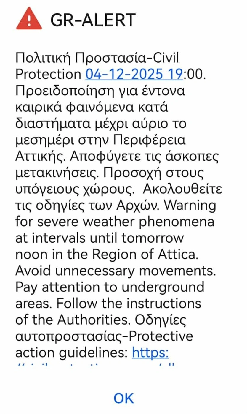 Μήνυμα από το 112 στάλθηκε προ ολίγου στους πολίτες της Αττικής, λόγω των έντονων φαινομένων της κακοκαιρίας Byron.