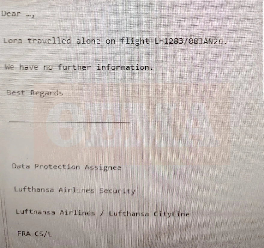 Στο μήνυμα που δημοσιεύει το protothema.gr, η Lufthansa φαίνεται να απαντά λιτά προς την ΕΛ.ΑΣ. πως «η Λόρα ταξίδεψε μόνη της στην πτήση LH1283 στις 8 Ιανουαρίου 2026. Δεν έχουμε περισσότερες πληροφορίες. Με εκτίμηση».