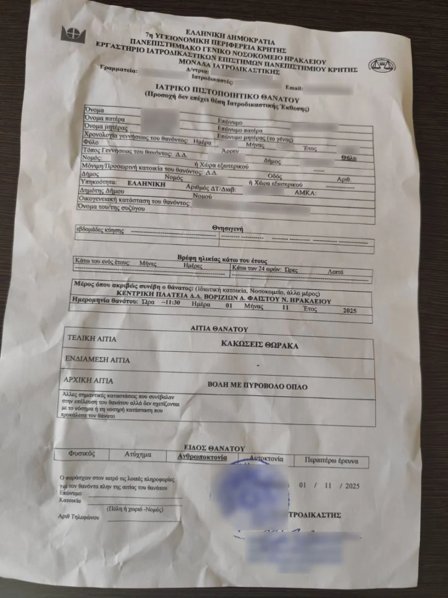 Το έγγραφο, που φέρει την υπογραφή της αναπληρώτριας προϊσταμένης της Ιατροδικαστικής Υπηρεσίας Κρήτης Ελένης Κρασανάκη, αναφέρει ρητά ότι η αιτία θανάτου είναι «κακώσεις θώρακα από βολή με πυροβόλο όπλο», ενώ ως είδος θανάτου προσδιορίζεται «ανθρωποκτονία».