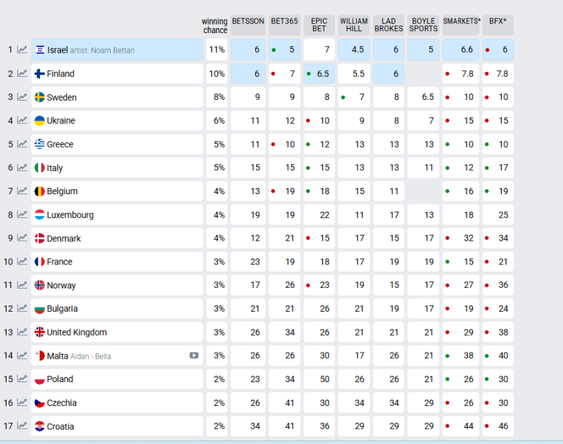 Με τα μέχρι τώρα δεδομένα μεγάλο φαβορί είναι το Ισραήλ, που πέρασε αυτήν την εβδομάδα στην πρώτη θέσ ων αποδόσεων των books, προσπερνώντας τη Φινλανδία η οποία για μερικές εβδομάδες είχε στρογγυλοκαθίσει στην κορυφή. Η εκπρόσωπος του Ισραήλ Noam Bettan οδήγησε σε εκτόξευση των αποδόσεων της χώρας στέλνοντάς το στην πρώτη θέση των προβλέψεων νίκης.
