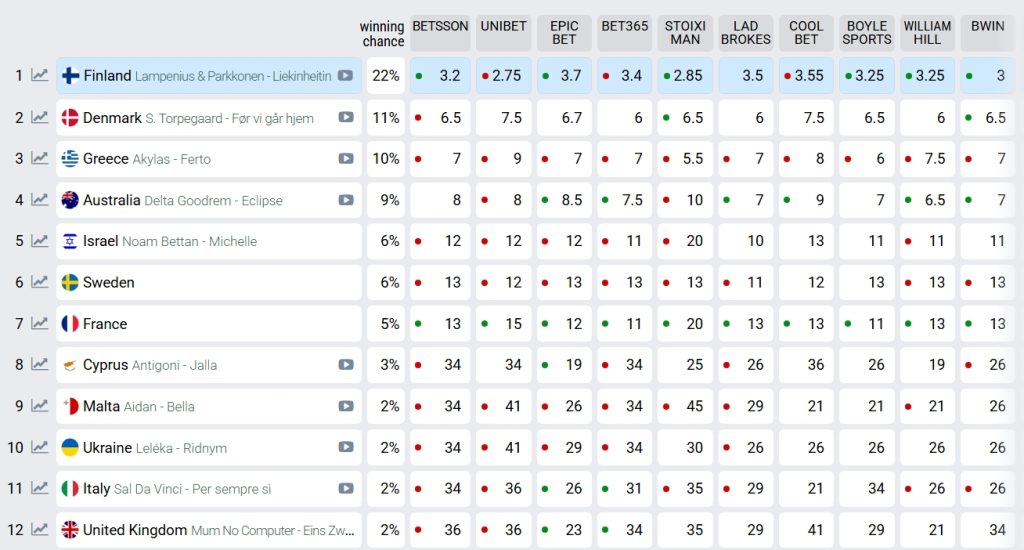 Στην αντίπερα όχθη, η Φινλανδία δείχνει να παίζει χωρίς αντίπαλο στην παρούσα φάση. Με το κομμάτι «Liekinheitin» να έχει κερδίσει τις εντυπώσεις μετά την πρόσφατη επιλογή του, η χώρα απολαμβάνει την πρώτη θέση με ποσοστό 21% και αποδόσεις που ξεκινούν από 2,8.