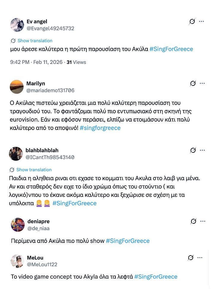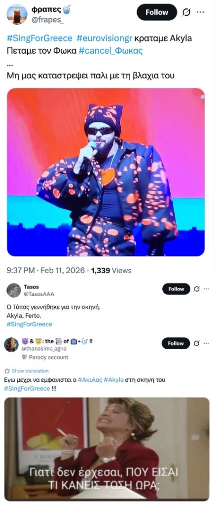Κόντρα σε ό,τι φοβόντουσαν πολλοί, πάντως, πως ο Akylas λόγω μεγάλων προσδοκιών θα απογοήτευε στο live, η εμφάνισή του με το «Ferto» αποθεώθηκε από τους υποστηρικτές του, με τους χρήστες του X να κάνουν «πάρτυ» στη δημοφιλή πλατφόρμα.