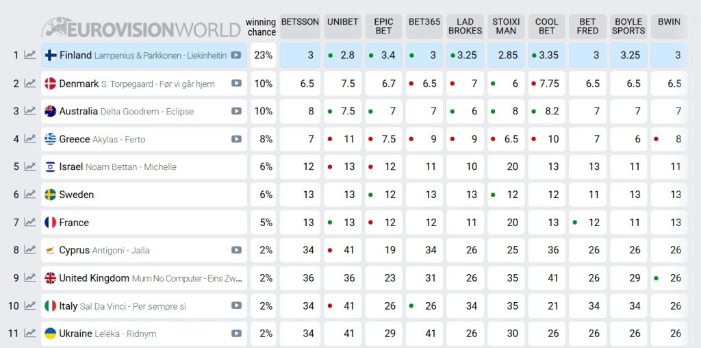Ξεκάθαρο φαβορί για τη νίκη στη Eurovision είναι η Φινλανδία, με το «Liekinheitin», η Δανία με το τραγούδι «Før vi går hjem» του Søren Torpegaard Lund φαίνεται να εδραιώνεται στη δεύτερη θέση, στην τρίτη βρίσκεται η Αυστραλία με το «Eclipse» της Delta Goodrem.