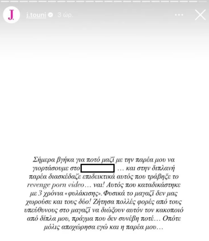 «Σήμερα βγήκα για ποτό μαζί με την παρέα μου να γιορτάσουμε στο… και στην διπλανή παρέα διασκέδαζε αυτός που τράβηξε το revenge porn video… ναι! Αυτός που καταδικάστηκε με 3 χρόνια «φυλάκισης». Φυσικά το μαγαζί δεν μας χωρούσε και τους δυο! Ζήτησα πολλές φορές από τους υπεύθυνους στο μαγαζί να διώξουν αυτόν τον κακοποιό από δίπλα μου, πράγμα που δεν συνέβη ποτέ… Οπότε μόλις αποχώρησα εγώ και η παρέα μου…»