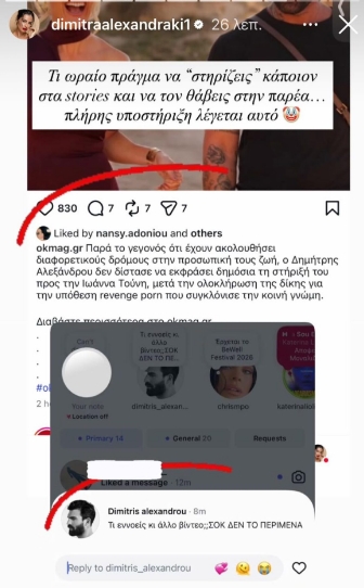 Όλα άρχισαν κάπως έτσι… Με μια ανάρτησή της που έκανε στον προσωπικό της λογαριασμό στο Instagram την Πέμπτη 2 Απριλίου, η Δήμητρα Αλεξανδράκη «άναψε» φωτιές φανερώνοντας την αλήθεια πίσω από την τελευταία ανάρτηση του Δημήτρη Αλεξάνδρου για την πρώην σύντροφό του Ιωάννα Τούνη, που σίγουρα θα συζητηθεί.
