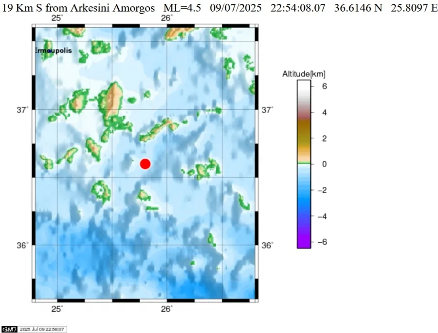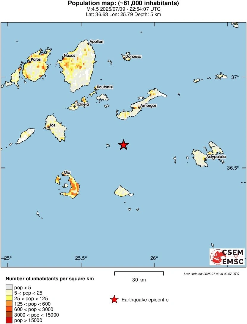 Σεισμική δόνηση μεγέθους 4,5 βαθμών της κλίμακας Ρίχτερ, σύμφωνα με την αυτόματη προκαταρκτική λύση του Ευρωπαϊκού – Μεσογειακού Σεισμολογικού Ινστιτούτου (EMSC), σημειώθηκε στη 01:54 μετά τα μεσάνυχτα (Πέμπτη 10/7), σε υποθαλάσσια περιοχή, κοντά σε Σαντορίνη και Αμοργό.