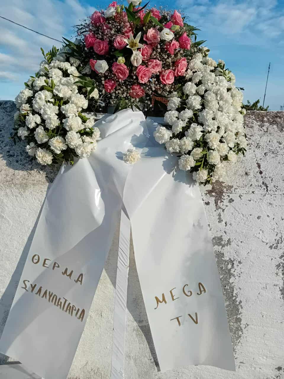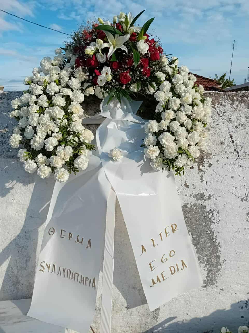 Ανάμεσά τους, στεφάνια από τον τηλεοπτικό σταθμό MEGA, όπου προβάλλεται η εκπομπή της, από τον την Alter Ego Media, από την εταιρεία παραγωγής Minister και τον Αντώνη Μάτσο, την Φαίη Σκορδά, αλλά από την εταιρεία παραγωγής ταινιών Faliro House – και τον ιδιοκτήτη της Χρήστο Κωνσταντακόπουλο με την σύζυγό του Μαρίνα.