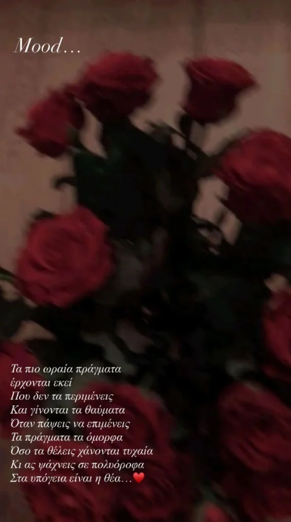 Χθες, Παρασκευή 26 Σεπτεμβρίου, με εμφανώς ρομαντική διάθεση, δημοσίευσε μια φωτογραφία με κόκκινα τριαντάφυλλα στα Instagram Stories της, συνοδεύοντάς την με στίχους από το τραγούδι του Πασχάλη Τερζή «Στα υπόγεια είναι η θέα»: «Τα πιο ωραία πράγματα έρχονται εκεί που δεν τα περιμένεις… Και γίνονται τα θαύματα όταν πάψεις να επιμένεις. Τα πράγματα τα όμορφα όσο τα θέλεις χάνονται τυχαία… Κι ας ψάχνεις σε πολυόροφα στα υπόγεια είναι η θέα».