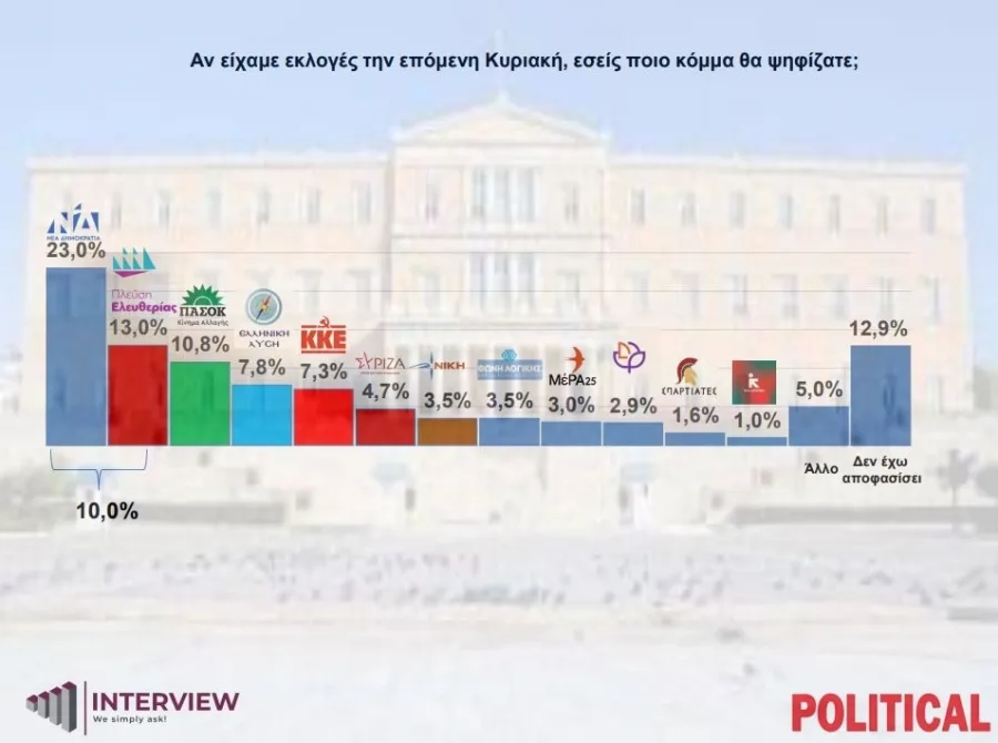Άνοδο της ΝΔ με 27% καταγράφει η δημοσκόπηση της Interview για λογαριασμό της political, αλλά και σταθεροποίηση της Πλεύσης Ελευθερίας στην δεύτερη θέση.