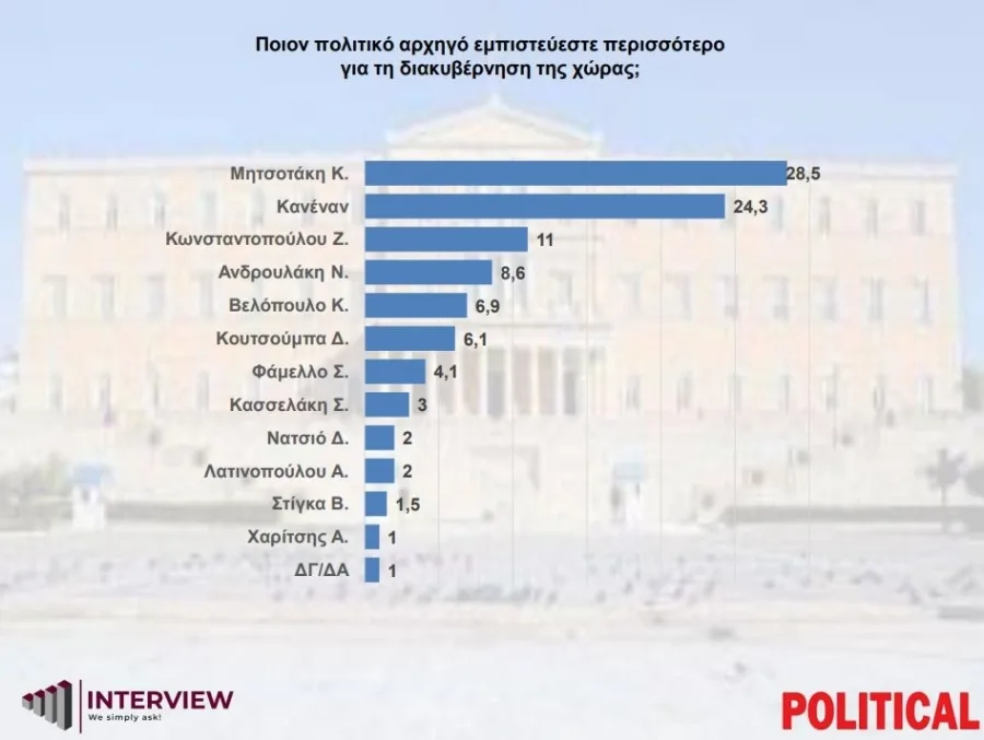Ο πρωθυπουργός Κυριάκος Μητσοτάκης παραμένει υψηλά στην καταλληλότητα για την διακυβέρνηση της χώρας. Στο ερώτημα «ποιον πολιτικό αρχηγό εμπιστεύεστε περισσότερο για τη διακυβέρνηση της χώρας», η απάντηση είναι: