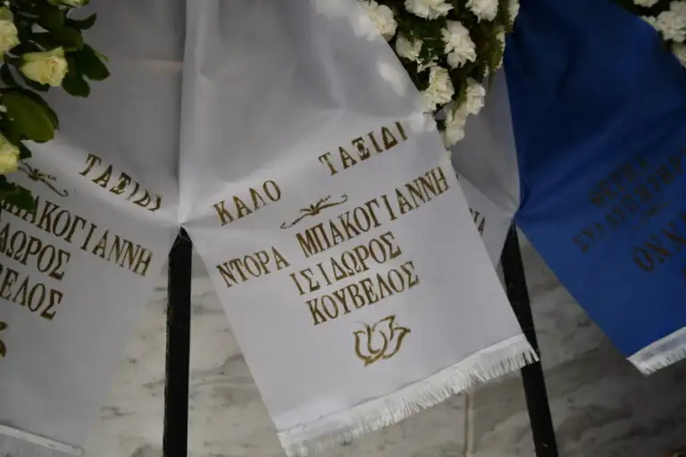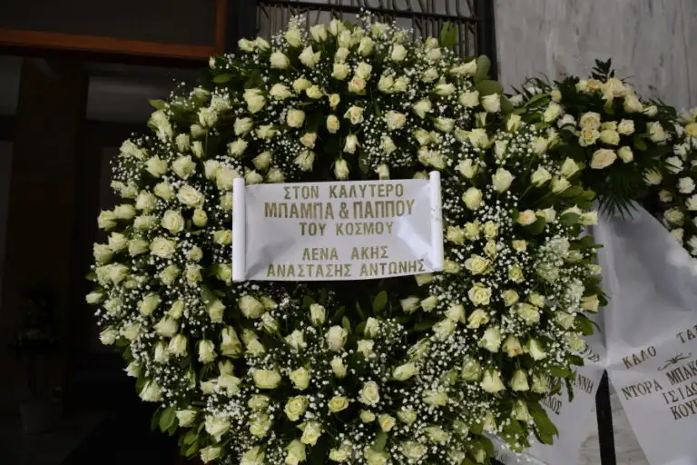 Στο στεφάνι που έστειλε η Λένα Παπαληγούρα μαζί με τον σύζυγό της και τα παιδιά τους γράφει: «Στον καλύτερο μπαμπά και παππού του κόσμου. Λένα, Άκης, Αναστάσης, Αντώνης».