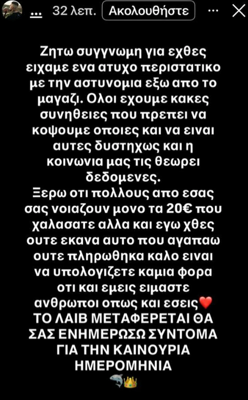 Μετά το περιστατικό, ο 21χρονος προχώρησε σε δημόσια ανάρτηση στα social media, ζητώντας συγγνώμη από τους ακολούθους του και παραδεχόμενος ότι έχει «κακές συνήθειες που πρέπει να κόψει». Ανέφερε επίσης ότι το ακυρωθέν live θα πραγματοποιηθεί σε νέα ημερομηνία.