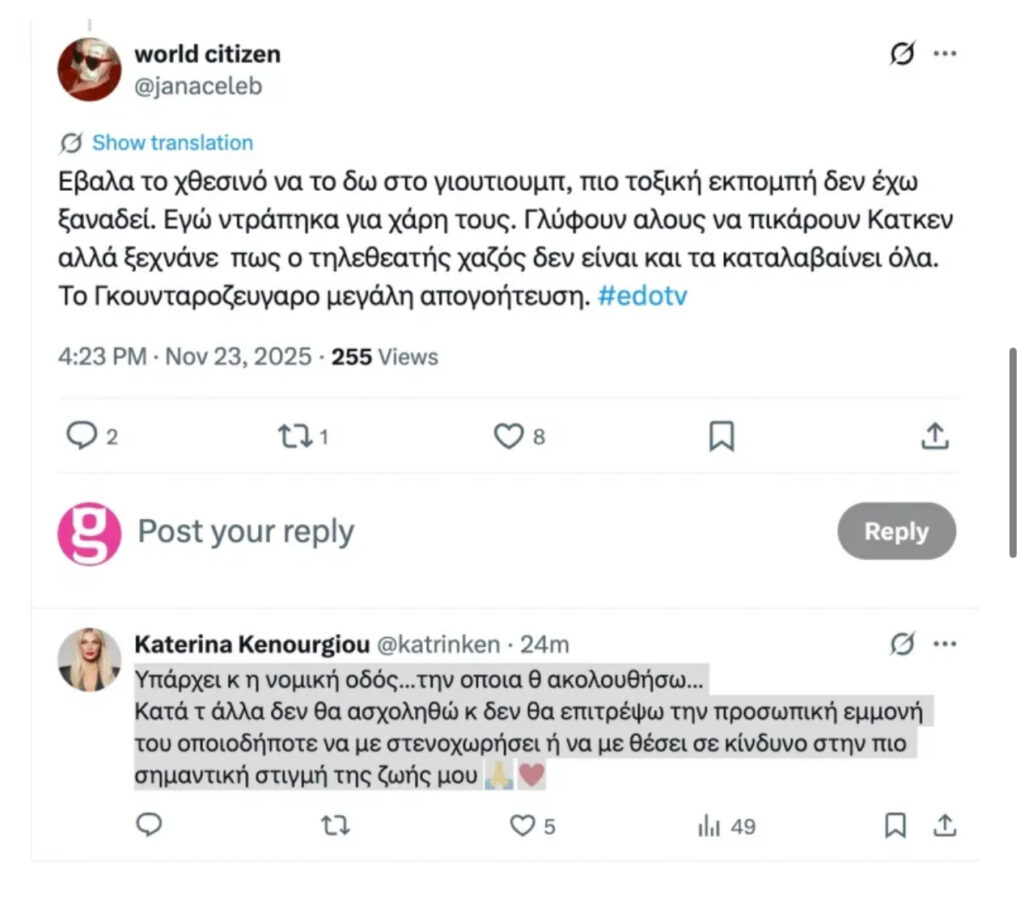 Η Κατερίνα Καινούργιου έγραψε χαρακτηριστικά σε σχόλιο που μιλούσε για την εκπομπή του Γρηγόρη Γκουνταρα και της Ναταλί Κάκκαβα: «Υπάρχει και η νομική οδός, την οποία θα ακολουθήσω…», δείχνοντας ότι σκέφτεται να κινηθεί νομικά εναντίον τους.
