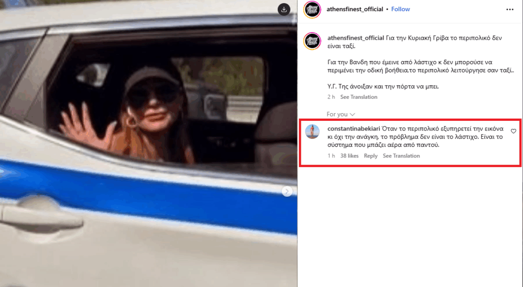 Συγκεκριμένα, η Κωνσταντίνα Μπεκιάρη έγραψε όλο νόημα: «Όταν το περιπολικό εξυπηρετεί την εικόνα και όχι την ανάγκη, το πρόβλημα δεν είναι το λάστιχο. Είναι το σύστημα που μπάζει αέρα από παντού».