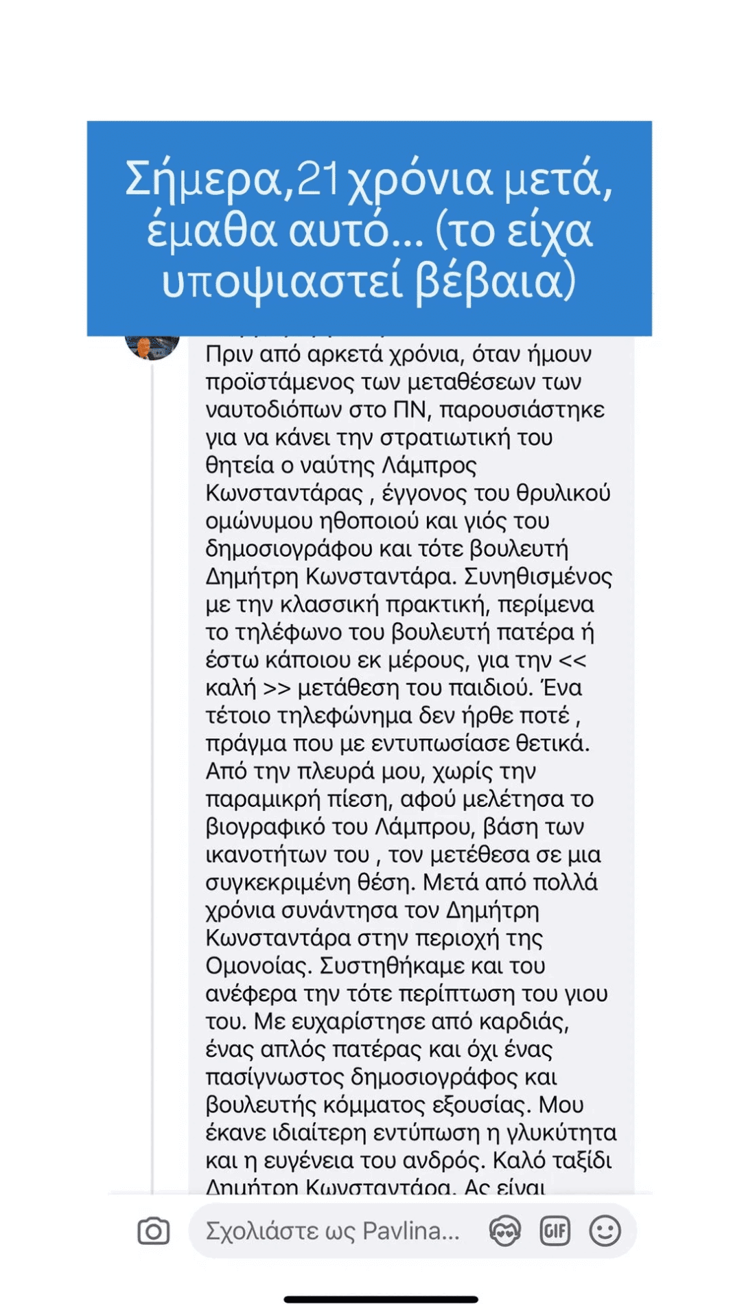 «Όταν ο πατέρας μου πήγε στρατό, είχε έναν ισχυρό πατέρα που θα μπορούσε να… διευκολύνει τη θητεία του. Αλλά για λόγους αρχής, δεν το έκανε. Όταν ήρθε η ώρα να κάνω τη θητεία μου εγώ, και πλέον ήταν αυτός ο ισχυρός, μαντέψτε τι έκανε…», έγραψε αρχικά ο Λάμπρος Κωνσταντάρας.