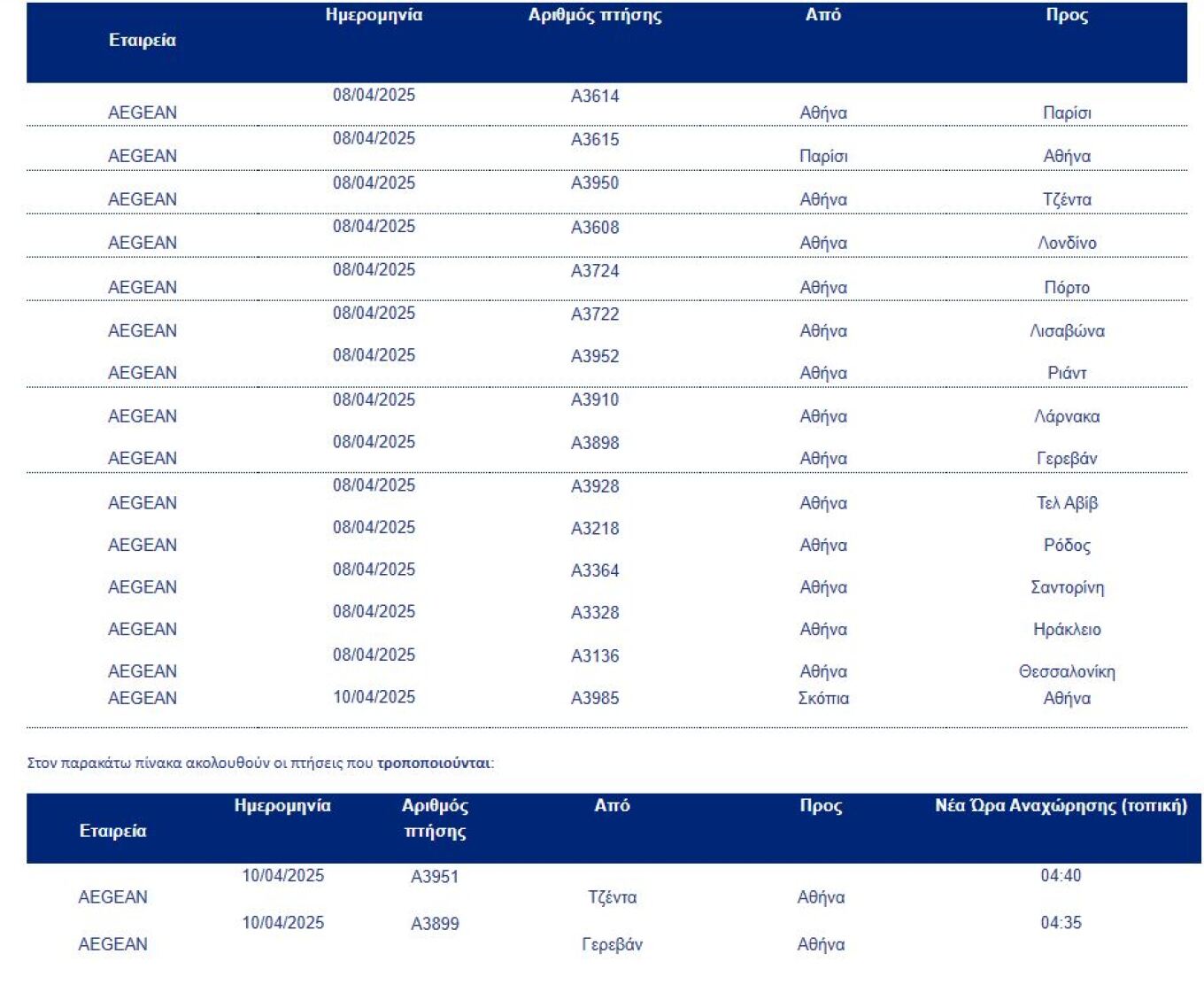 Συγκεκριμένα, την Τετάρτη 9 Απριλίου 2025 ακυρώνονται όλες οι προγραμματισμένες πτήσεις του δικτύου εσωτερικού και εξωτερικού, εκτός από τις παρακάτω, οι οποίες θα πραγματοποιηθούν με τις κάτωθι τροποποιήσεις: