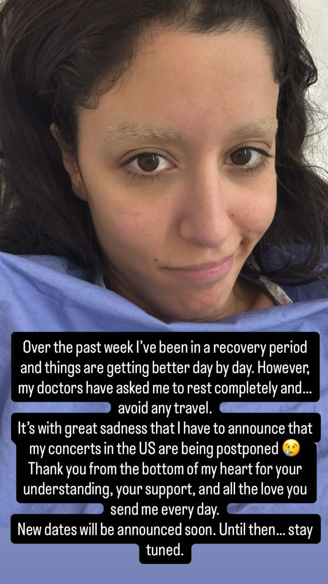 «Την τελευταία εβδομάδα βρίσκομαι σε περίοδο ανάρρωσης και σιγά σιγά τα πράγματα πηγαίνουν καλύτερα. Οι γιατροί, όμως, μου ζήτησαν απόλυτη ξεκούραση και καμία μετακίνηση. Με μεγάλη μου λύπη πρέπει να ανακοινώσω ότι οι συναυλίες μου στην Αμερική αναβάλλονται. Σας ευχαριστώ από καρδιάς για την κατανόηση, τη στήριξη και όλη την αγάπη που μου στέλνετε καθημερινά. Οι νέες ημερομηνίες θα ανακοινωθούν σύντομα. Μέχρι τότε… stay tuned», έγραψε η Μαρίνα Σάττι.