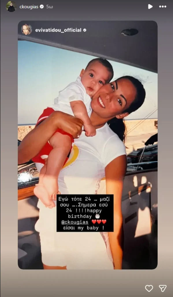Νωρίτερα του ευχήθηκε και η μητέρα του, Εύη Βατίδου και δημόσια με μια ανάρτηση στο προφίλ της στο Instagram. «Εγώ τότε 24… μαζί σου… Σήμερα εσύ 24! Happy birthday. Είσαι my baby», έγραψε στην ανάρτησή της.