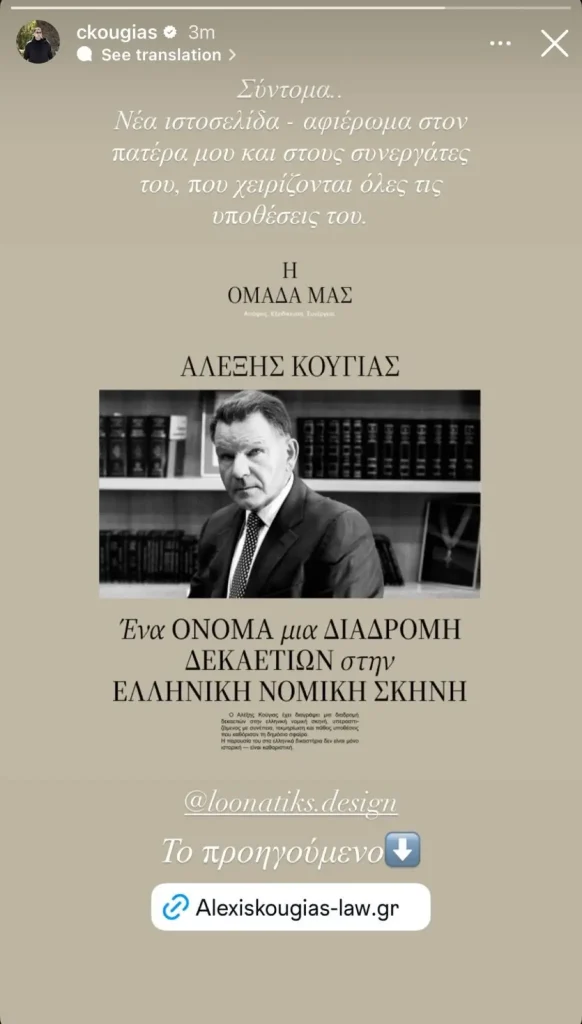 «Σύντομα… Νέα ιστοσελίδα – αφιέρωμα στον πατέρα μου και στους συνεργάτες του, που χειρίζονται όλες τις υποθέσεις του», έγραψε ο Χρίστος Κούγιας στην ανάρτησή του, εξηγώντας πως θα είναι ανοιχτή προς το κοινό σε λίγο καιρό.
