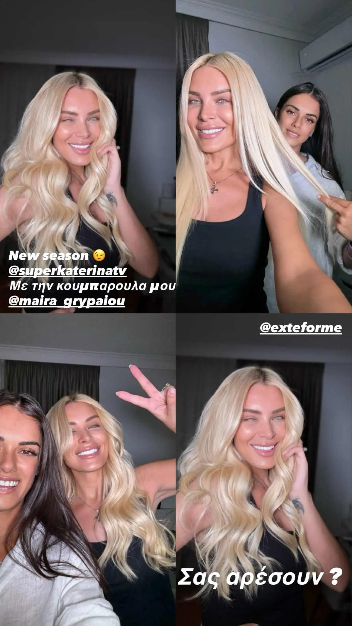 Η Κατερίνα επισκέφθηκε την αγαπημένη της κομμώτρια και κουμπάρα, ΜάιραΓρυπάιου, και πρόσθεσε extensions, αποκτώντας πλούσια, μακριά και κυματιστά ξανθά μαλλιά. Με χαμόγελο, πόζαρε μπροστά στον φακό δείχνοντας το νέο της look και ρωτώντας τους followers της «Σας αρέσουν;».