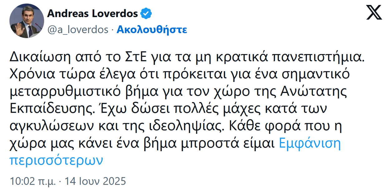«Δικαίωση από το ΣτΕ για τα μη κρατικά πανεπιστήμια. Χρόνια τώρα έλεγα ότι πρόκειται για ένα σημαντικό μεταρρυθμιστικό βήμα για τον χώρο της Ανώτατης Εκπαίδευσης», έγραφε στο X ο Ανδρέας Λοβέρδος στα μέσα του Ιουνίου.
