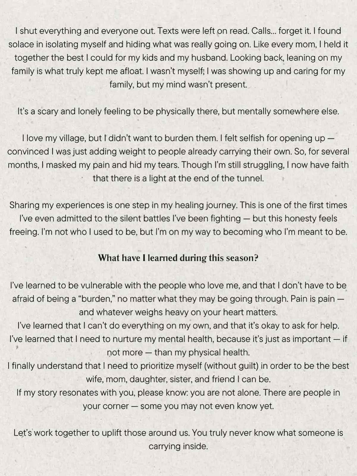 Το να είσαι ευάλωτη στις μέρες μας είναι κάπως τρομακτικό, αλλά αν μπορέσω να βοηθήσω έστω και ένα άτομο, πιστεύω ότι το να μοιραστώ την ιστορία μου αξίζει. Δεν μοιράζομαι την εμπειρία μου για συμπόνια ή επαίνους — μοιράζομαι γιατί θέλω να χρησιμοποιήσω τη φωνή μου με την ελπίδα να βοηθήσω κάποιον άλλο που μπορεί να παλεύει με την ψυχική του υγεία. Αν και η δική μου ιστορία επικεντρώνεται στην επιλόχεια κατάθλιψη, ελπίζω να τη διαβάσεις και να την εφαρμόσεις σε ό,τι κι αν περνάς.