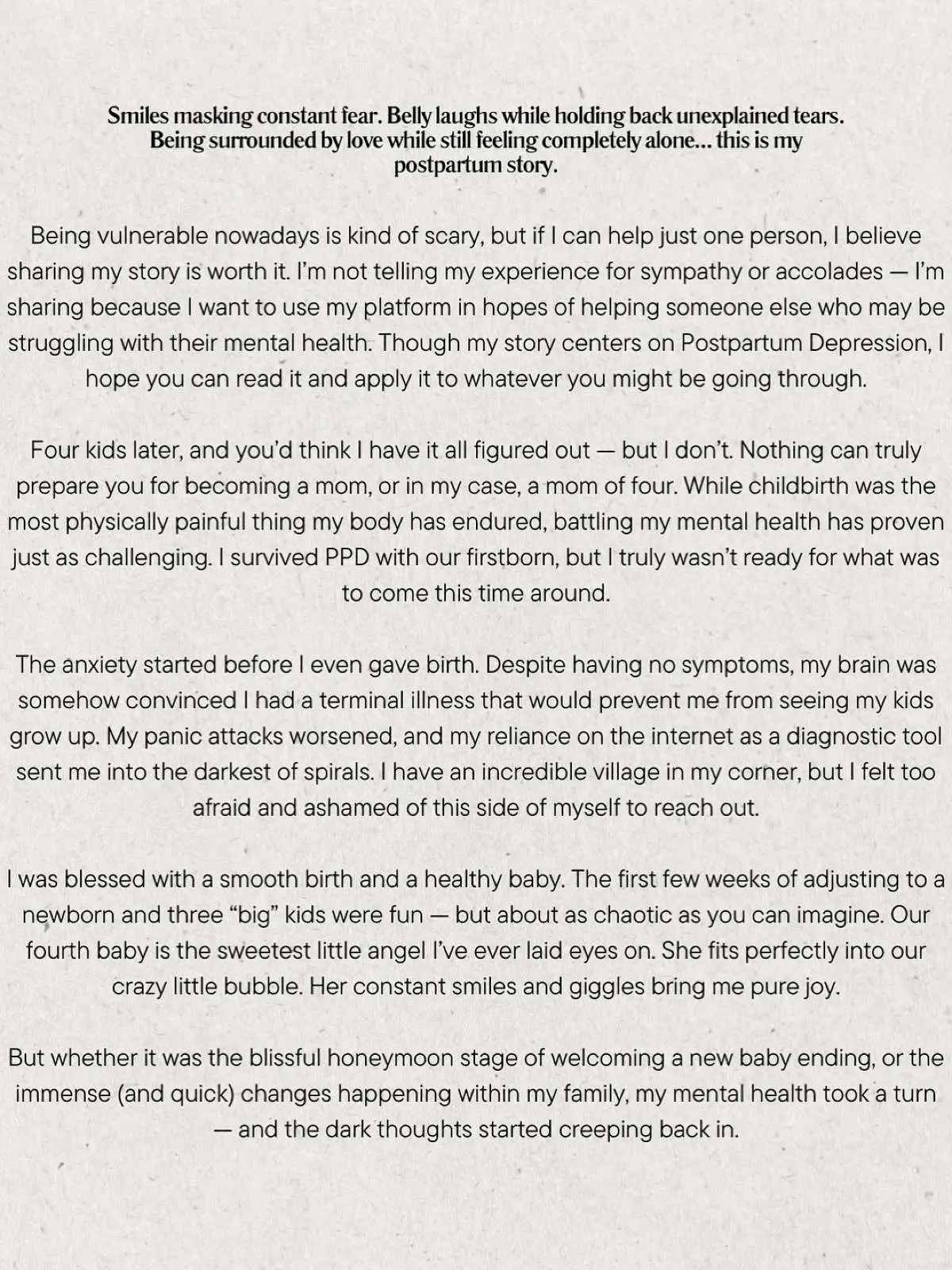 Μετά από τέσσερα παιδιά, θα πίστευε κανείς ότι τα έχω όλα καταλάβει — αλλά δεν ισχύει. Τίποτα δεν μπορεί να σε προετοιμάσει για το να γίνεις μητέρα, ή στην περίπτωσή μου, μητέρα τεσσάρων. Ενώ ο τοκετός ήταν ο πιο σωματικά επώδυνος πόνος που άντεξε το σώμα μου, το να παλεύω με την ψυχική μου υγεία αποδείχτηκε εξίσου δύσκολο. Επιβίωσα από επιλόχεια κατάθλιψη στο πρώτο μας παιδί, αλλά πραγματικά δεν ήμουν προετοιμασμένη για όσα θα ερχόντουσαν αυτή τη φορά.