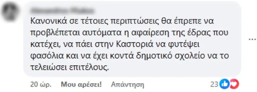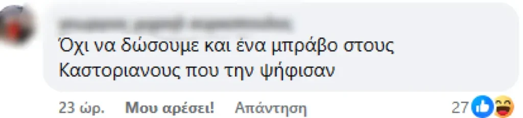 Τα σχόλια του κόσμου στις δηλώσεις της υπήρξαν καταιγιστικά, ενώ δεν έλειψε η κριτική. «Σε τέτοιες περιπτώσεις, θα έπρεπε να προβλέπεται αυτόματα η αφαίρεση της έδρας που κατέχει, να πάει στην Καστορία να φυτέψει φασόλια και να έχει κοντά δημοτικό σχολείο να το τελειώσει επιτέλους» γράφει ένας χρήστης. Άλλο σχόλιο κατακρίνει τους ψηφοφόρους τους, γράφοντας: «όχι να δώσουμε ένα μπράβο στους Καστοριανούς που την ψήφισαν», ενώ κάποιοι άλλοι κάνουν αναγωγή στην τάση που υπάρχει σήμερα για την άγνοια της ιστορίας από τα νέα παιδιά «Άλλη από εδώ, μετά λέμε γιατί δεν ξέρουν ιστορία τα παιδιά μας! Πάρτε παράδειγμα, ντροπή!»