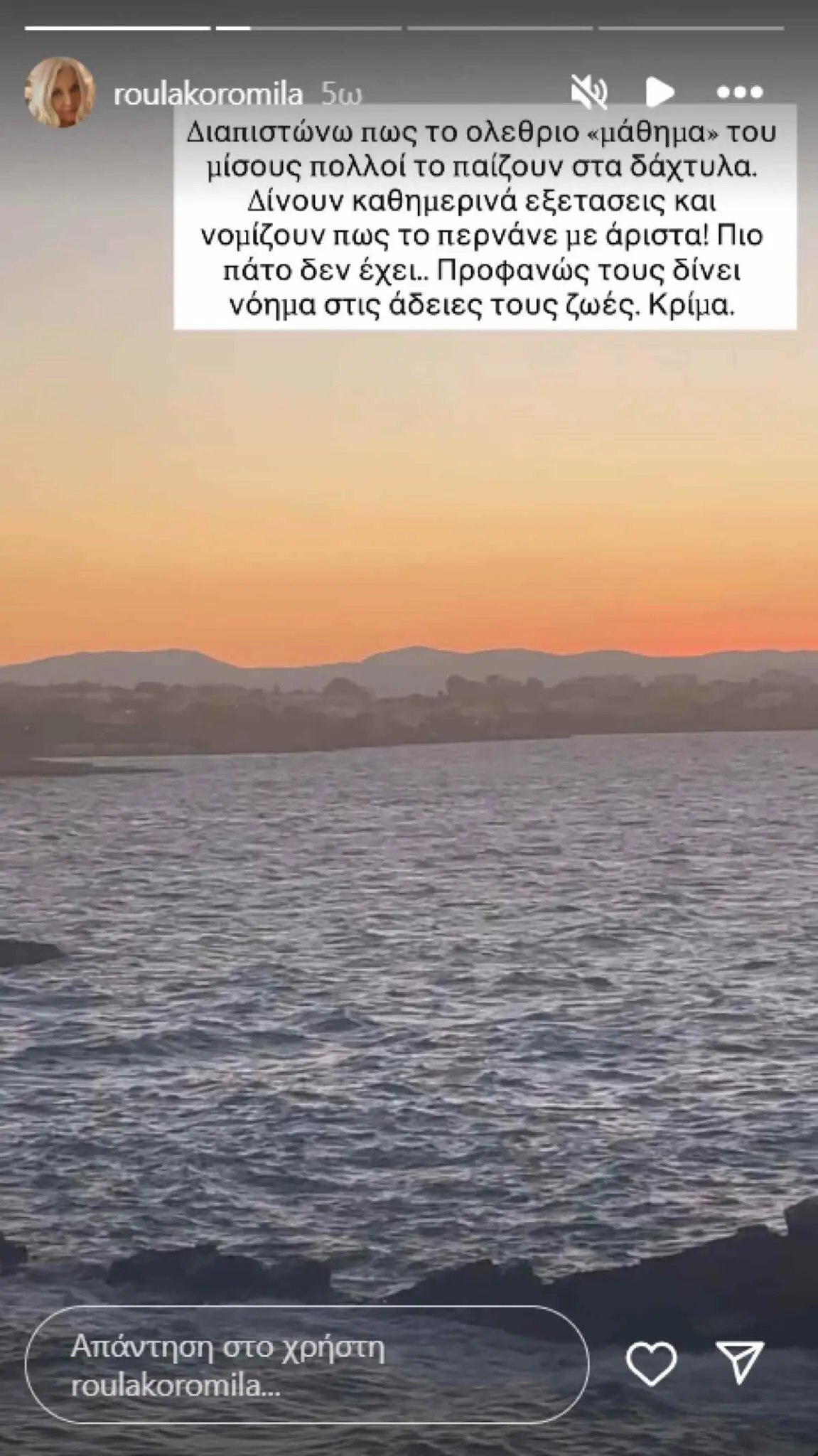 H Ρούλα Κορομηλά, σήμερα, Σάββατο 4 Οκτωβρίου, προέβη σε μια ακόμη οργισμένη ανάρτηση στον προσωπικό της λογαριασμό στο Instagram, με την ίδια να ξεσπά για την αρνητικότητα που παρακολουθεί γύρω της. Η επιτυχημένη παρουσιάστρια από τότε που απομακρύνθηκε από τα τηλεοπτικά δρώμενα, χρησιμοποιεί τα social media για να σχολιάζει την επικαιρότητα και να μένει σε επικοινωνία με το κοινό της, το οποία πάντα την αποθεώνει κάτω από τις αναρτήσεις της.