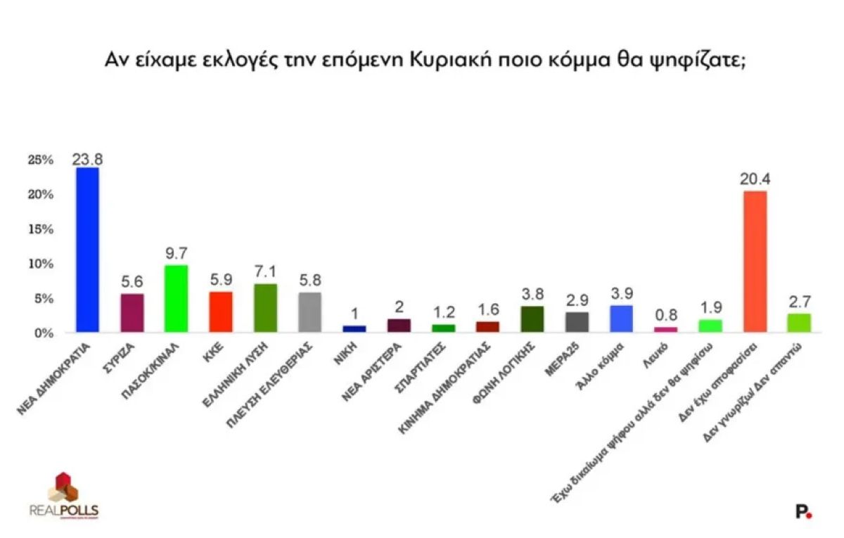 Στην πρόθεση ψήφου, η ΝΔ συγκεντρώνει 23,8%, διατηρώντας σημαντικό προβάδισμα 14,1 μονάδων έναντι του ΠΑΣΟΚ, που φτάνει στο 9,7%.