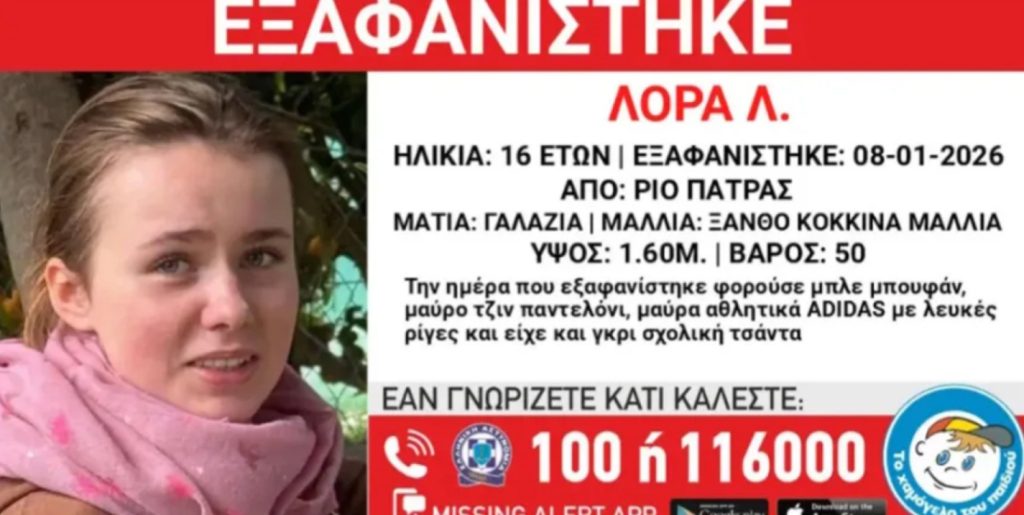 Η Λόρα αγνοείται από το πρωί της Πέμπτης 8 Ιανουαρίου – Την υπόθεση χειρίζεται η Εισαγγελία, ενώ στις έρευνες συνδράμει και το Χαμόγελο του Παιδιού