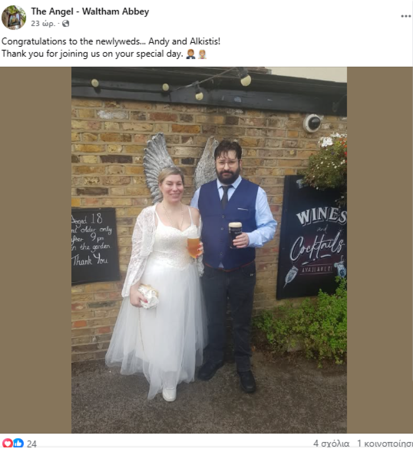 Το ζευγάρι επέλεξε να κάνει γαμήλιο πάρτι σε παμπ στο Λονδίνο. Σε ανάρτηση που έκανε ο επίσημος λογαριασμός του μαγαζιού, The Angel Waltham Abbey φαίνεται η Άλκηστις Αλεξανδράτου με το νυφικό της, ποζάροντας χαμογελαστή στο πλευρό του συζύγου της.