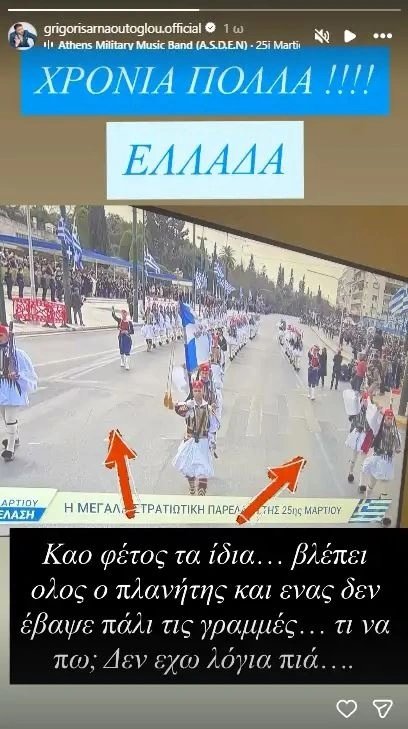 Ξέσπασε ο Γρηγόρης Αρναούτογλου. Η ημέρα της εθνικής επετείου της 25ης Μαρτίου αποτελεί παραδοσιακά μια στιγμή κατά την οποία τα βλέμματα όλων των Ελλήνων, αλλά και πολλών διεθνών μέσων ενημέρωσης, στρέφονται στο κέντρο της Αθήνας για τη μεγαλειώδη στρατιωτική παρέλαση.