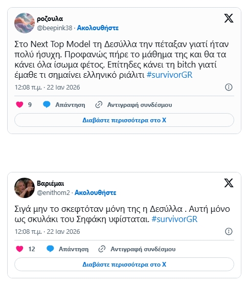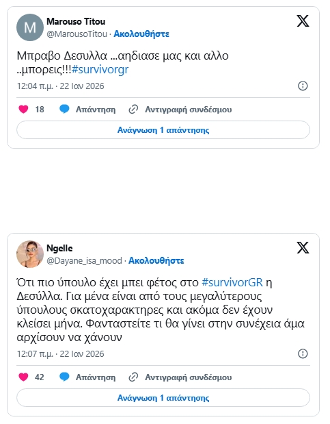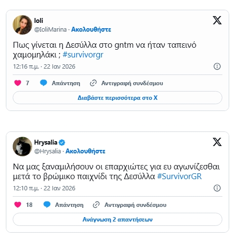 Πρώτο trend στο X έγινε το όνομα της Ιωάννας Δεσύλλα μετά το επεισόδιο του Survivor που προβλήθηκε το βράδυ της Τετάρτης 21 Ιανουαρίου. Όλα ξεκίνησαν από το αγώνισμα στο οποίο η ίδια έφερε τον τελικό και νικητήριο πόντο για τους Επαρχιώτες, κουνώντας τη δοκό και ρίχνοντας την αντίπαλό της.