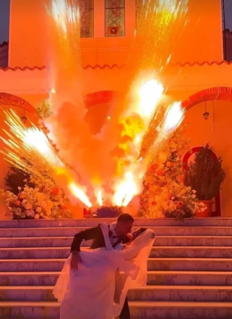 Μάλιστα, εντυπωσιάζει η στιγμή που ο Σάκης Κατσούλης πιάνει την Μαριαλένα Ρουμελιώτη για να την φιλήσει μπροστά σε όλους στα σκαλιά της εκκλησίας και από πίσω σκάνε πυροτεχνήματα, κάνοντας την εικόνα μαγική.