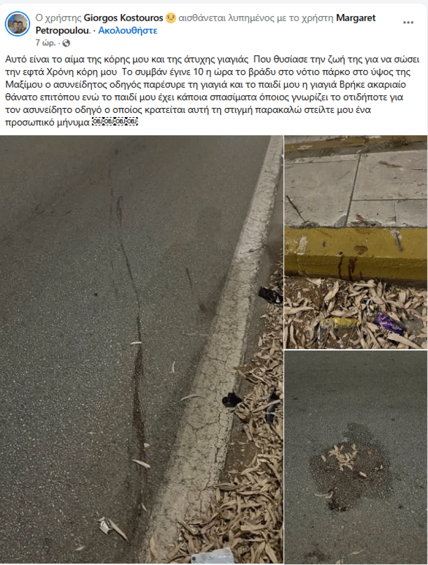 Εν τω μεταξύ με ανάρτησή του στο Facebook ο πατέρας γράφει χαρακτηριστικά, συνοδεύοντάς την και με φωτογραφίες από το σημείο «αυτό είναι το αίμα της κόρης μου». Όπως γράφει, για την ηλικιωμένη «θυσίασε την ζωή της για να σώσει την εφτάχρόνη κόρη μου. Το συμβάν έγινε 10 η ώρα το βράδυ στο νότιο πάρκο στο ύψος της Μαξίμου ο ασυνείδητος οδηγός παρέσυρε τη γιαγιά και το παιδί μου. Η γιαγιά βρήκε ακαριαίο θάνατο επιτόπου ενώ το παιδί μου έχει κάποια σπασίματα. Όποιος γνωρίζει το οτιδήποτε για τον ασυνείδητο οδηγό ο οποίος κρατείται αυτή τη στιγμή παρακαλώ στείλτε μου ένα προσωπικό μήνυμα».