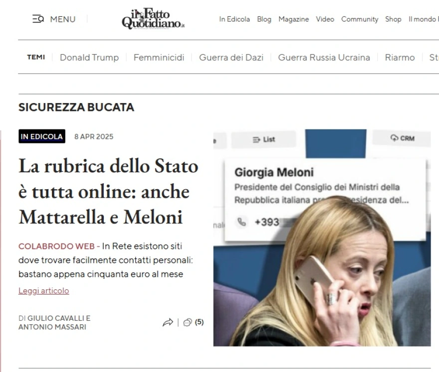 Αποκάλυψη της Fatto Quotidiano για διαρροή τηλεφωνικών αριθμών κυβερνητικών αξιωματούχων, υπουργών και στελεχών της Αστυνομιάς.