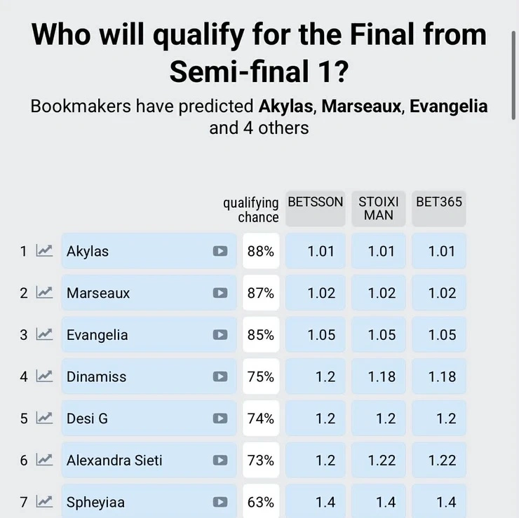 Σύμφωνα με τις τελευταίες εκτιμήσεις των στοιχηματικών εταιρειών, τέσσερα ονόματα ξεχωρίζουν μέχρι στιγμής. Ο Ακύλας εμφανίζεται στην κορυφή με ποσοστό πρόκρισης 88%, ακολουθεί η Μαρσό με 87%, η Ευαγγελία με 85%, ενώ οι Dinamiss κινούνται στο 75%, διατηρώντας ισχυρή δυναμική.