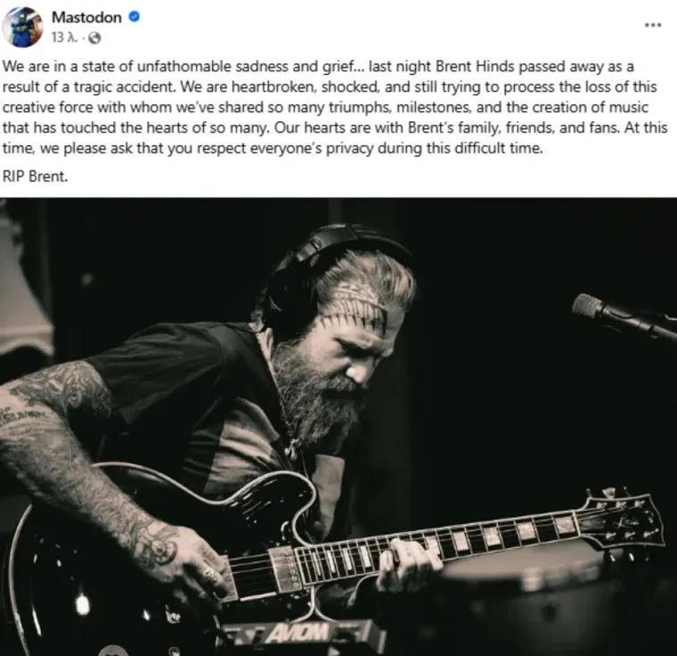 Σοκ έχει σκορπίσει στον παγκόσμιο χώρο της μουσικής η είδηση του θανάτου του Μπρεντ Χιντς, πρώην κιθαρίστα και ιδρυτικού μέλους του διάσημου μέταλ συγκροτήματος Mastodon.