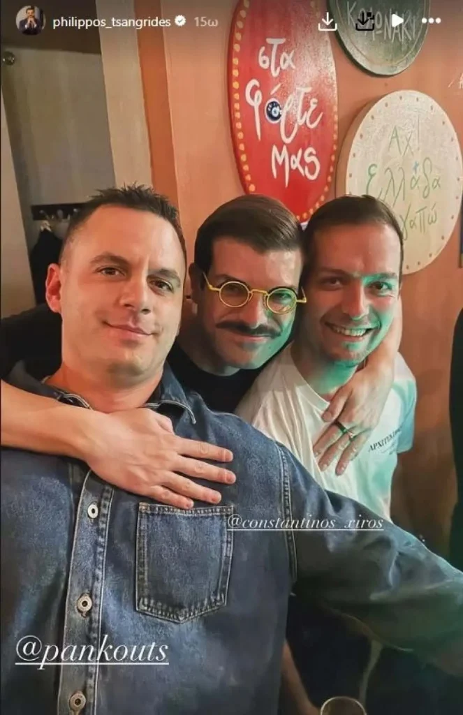 Ο Παναγιώτης Κουτσουμπής, ο Φίλιππος Τσαγκρίδης και ο φίλος τους εμφανίζονται να ποζάρουν χαλαροί στο στιγμιότυπο, δείχνοντας να απολαμβάνουν τη στιγμή.