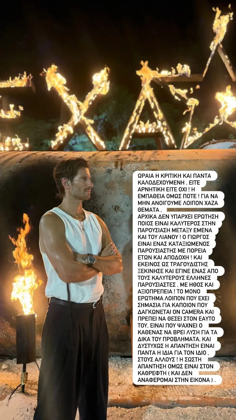 «Ωραία η κριτική και πάντα καλοδεχούμενη, είτε αρνητική, είτε όχι! Η εμπάθεια όμως ποτέ! Για να μην ανοίγουμε λοιπόν χαζά θέματα: Αρχικά δεν υπάρχει ερώτηση ποιος είναι καλύτερος στην παρουσίαση μεταξύ εμένα και του Λιανού. Ο Γιώργος είναι ένας καταξιωμένος παρουσιαστής με πορεία ετών και αποδοχή».