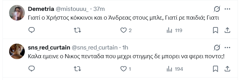 Αν παρακολουθείς το παιχνίδι, θα έχεις ήδη καταλάβει πως ο Ανδρέας και ο Νίκος μέχρι στιγμής είναι στην κόκκινη ομάδα. Αυτό σημαίνει πως με κάποια κριτήρια τα οποία ακόμη δεν γνωρίζουμε, πήραν μεταγραφή στη μπλε ομάδα. Τυπικά όμως, όταν γίνει πια και η ένωση και δεν θα έχουμε ομάδες, 7 παίκτες της κόκκινης ομάδας προκρίθηκαν και αυτό είναι μεγάλη επιτυχία.