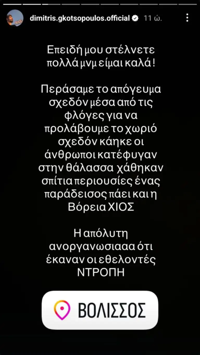 Στο νησί σε αυτές τις κρίσιμες ώρες βρίσκεται και ο ηθοποιός, Δημήτρης Γκοτσόπουλος, ο οποίος με μια ανάρτηση στα Instagram Stories του, περιέγραψε την εμπειρία του για τα όσα εκτυλίσσονται στην Χίο.