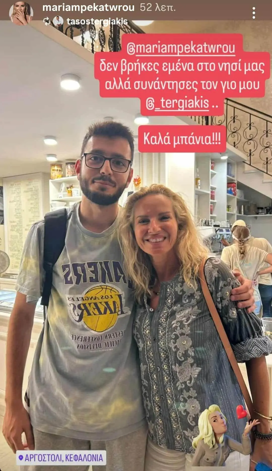 Επιπλέον, ο Τάσος μοιράστηκε στα social media μια τυχαία συνάντηση της Μαρίας Μπεκατώρου με τον γιο του στην Κεφαλονιά, προσθέτοντας μια χιουμοριστική νότα στην ανάρτησή του.
