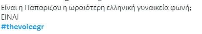 Η εμφάνισή της δεν άργησε να γίνει πρώτο θέμα στο Twitter, με τους χρήστες να την αποθεώνουν και να γεμίζουν το timeline με σχόλια θαυμασμού. Πολλοί μίλησαν για ένα από τα πιο δυνατά looks της φετινής σεζόν, ενώ άλλοι τόνισαν πως η Ελένα Παπαρίζου ξέρει πάντα πώς να συνδυάζει κομψότητα, λάμψη και star quality.