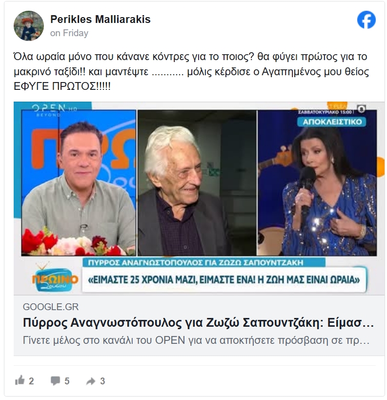 «Όλα ωραία μόνο που κάνανε κόντρες για το ποιος? θα φύγει πρώτος για το μακρινό ταξίδι!! και μαντέψτε ……….. μόλις κέρδισε ο Αγαπημένος μου θείος ΕΦΥΓΕ ΠΡΩΤΟΣ!!!!!» έγραψε χαρακτηριστικά.