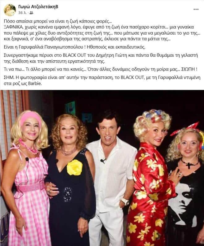 Ο σκηνοθέτης της παράστασης «Black Out the Sequel», Δημήτρης Γιώτης, μέσα από μια συγκινητική ανάρτηση στο Facebook, αποχαιρέτησε τη Γαρυφαλλιά: «Σίγουρα είναι ψέμα… δεν μπορώ να το πιστέψω… δεν μπορεί να ναι αλήθεια…